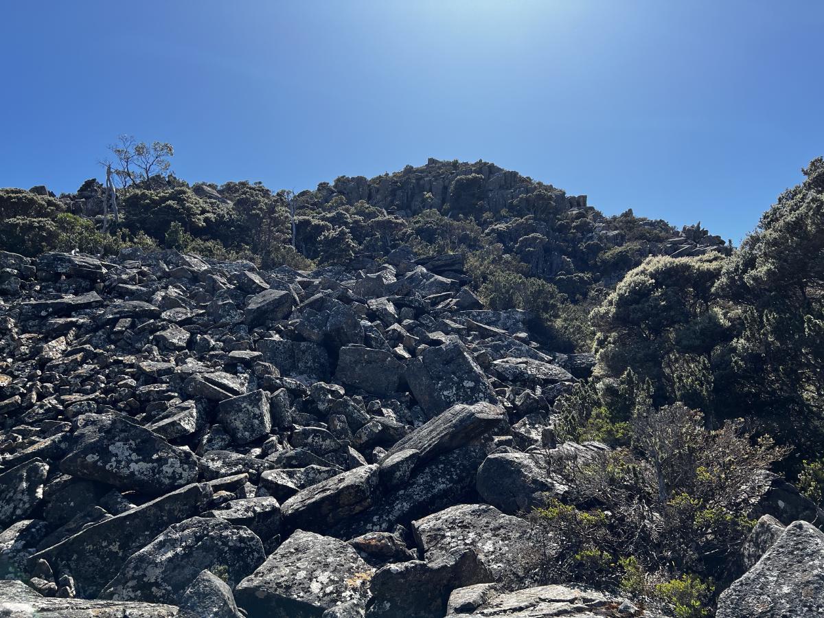 The view of the peak came only in the final 20 minutes, after popping out onto another large scree field and getting out from under the canopy.