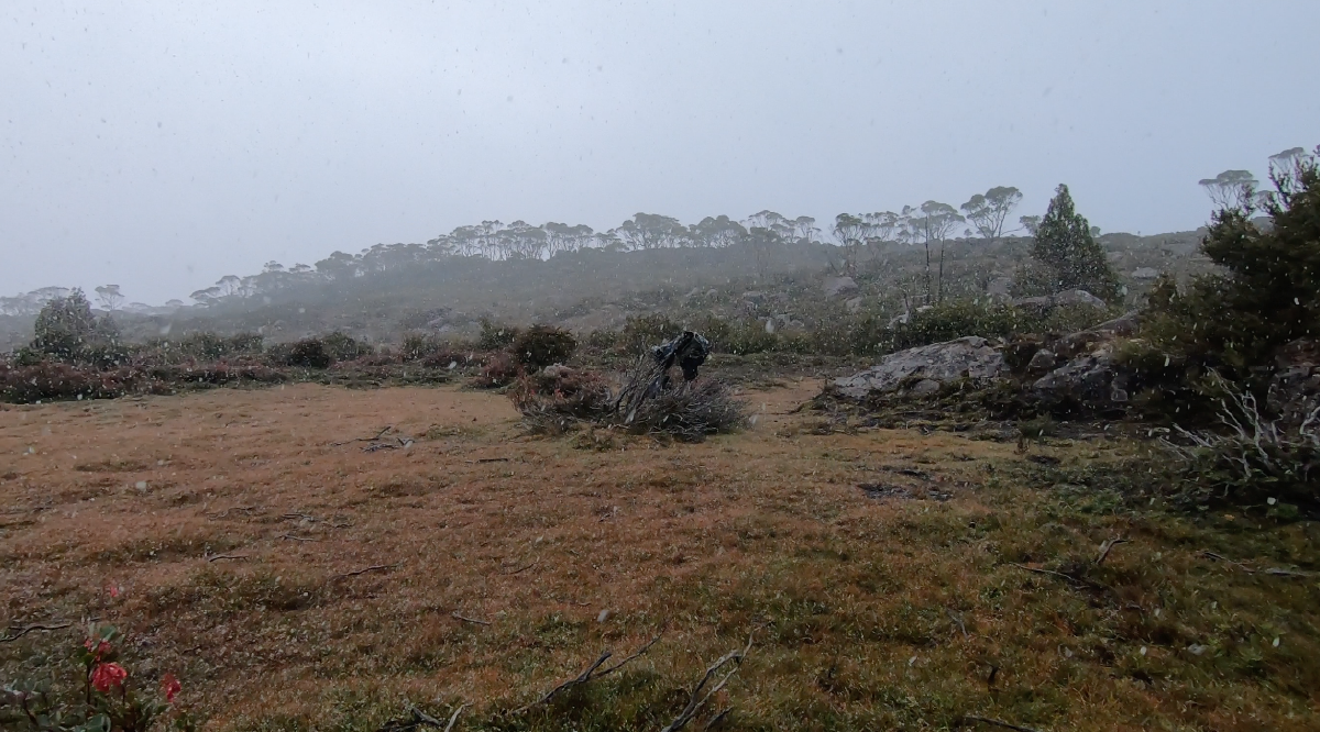Amazingly, we found a flat little area with some nice shelter. Water wasn’t too far away either. Perfect to wait out the conditions and hope for a better day the next day.