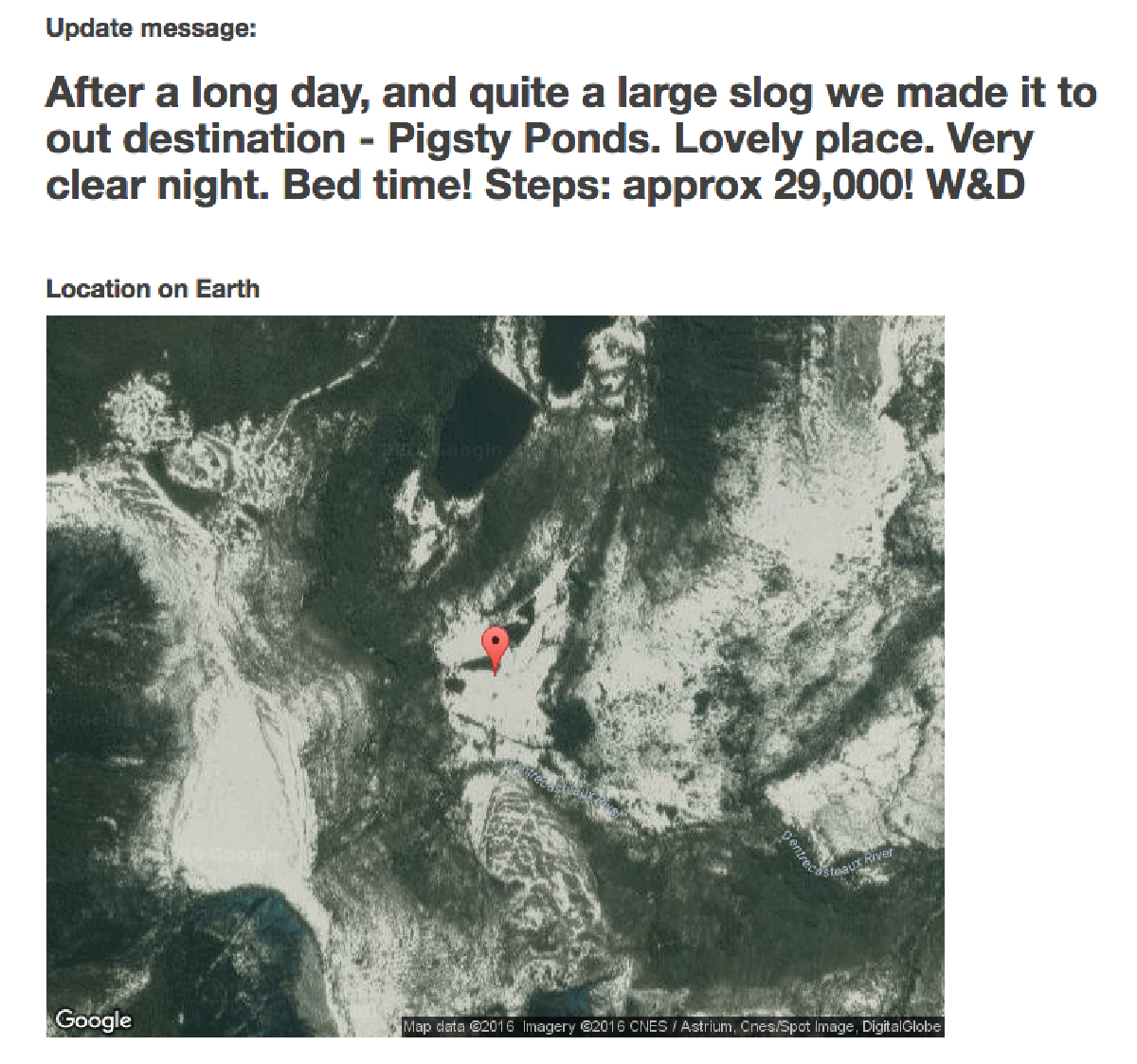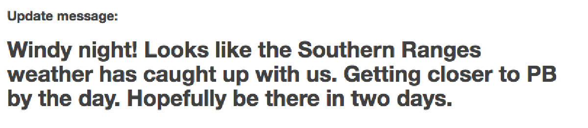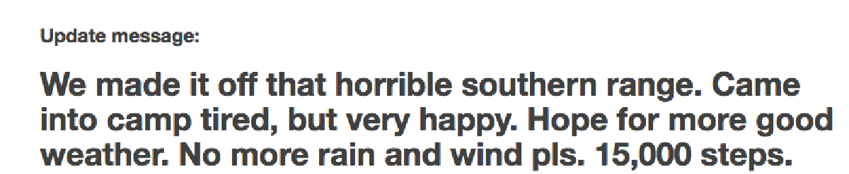 I had a two-way satellite messenger with me and used it regularly for the trip to let everyone know what we’d done that day/we were okay. I’ll use those messages in this post, because they’re more revealing of our mood/feelings at the time.