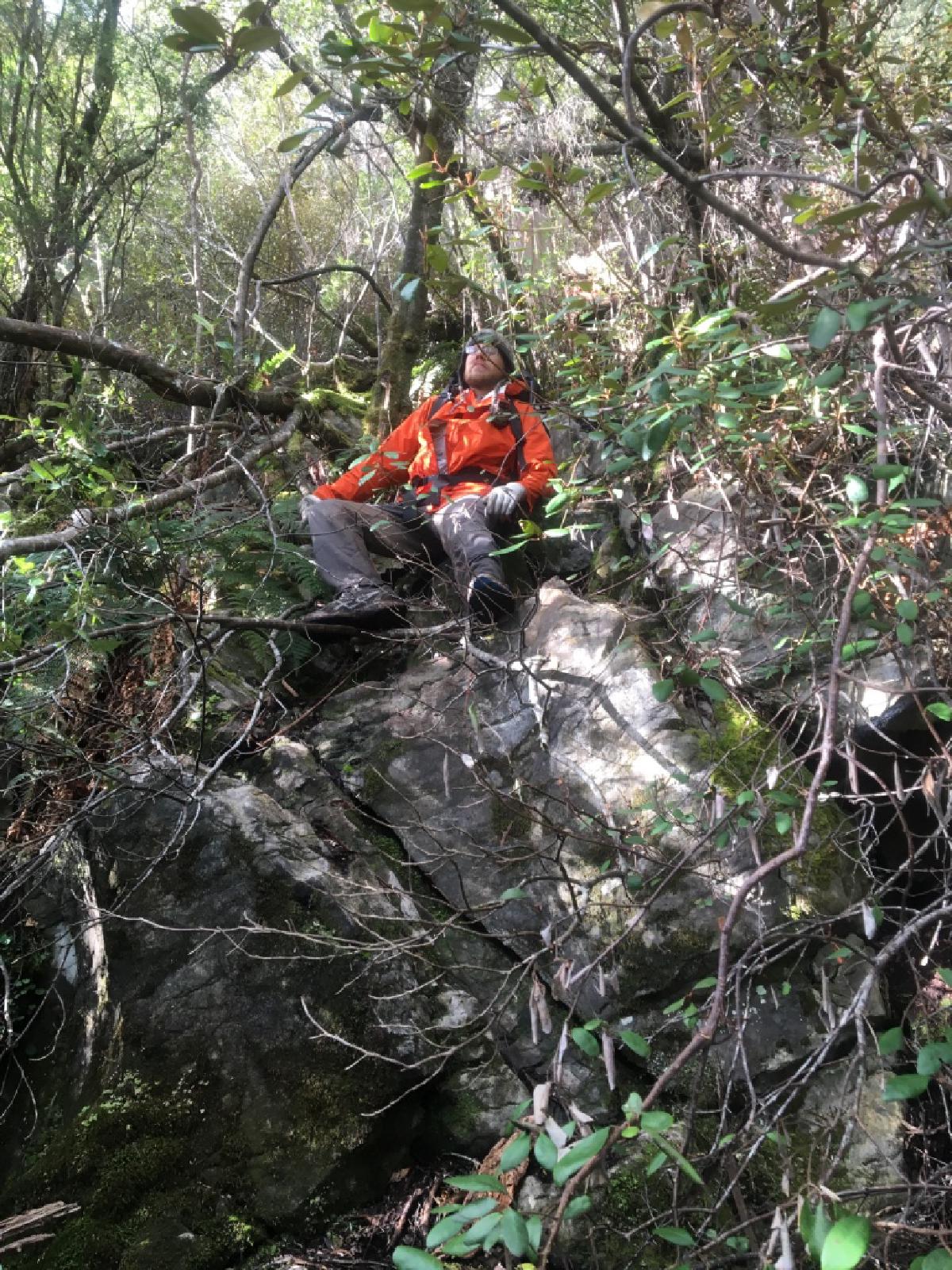 The snow walking (well, falling through to the ground below) continued for a while on and off. There was boulder jumping, and the grab for a plant/bush and hope-to-hell-it-holds. As I say, slow going.