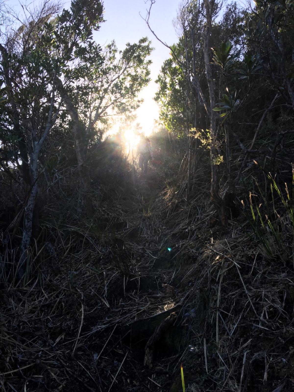 We said goodbye to Dad, who was about to fall asleep (and I think had a several hour nap as we thrashed our way up to Moonlight Ridge), and walked into the bush.